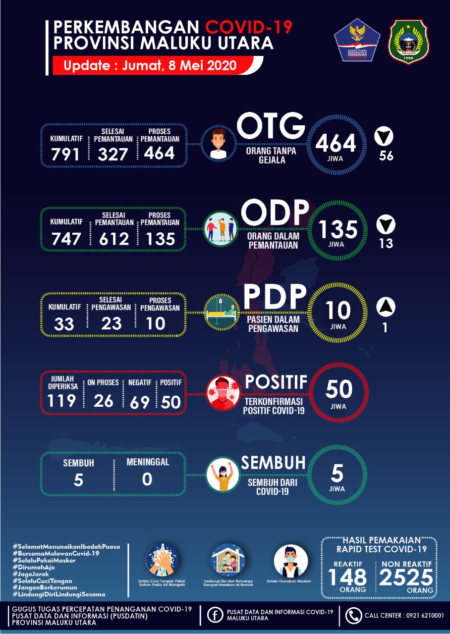 Gugus Tugas (Gustu) Percepatan Penanganan Covid-19 Provinsi Maluku Utara, kembali melaporkan status kasus covid-19 per Jumat (08/05/2020). Berdasarkan rilis pers yang diterima Haliyora.com, Disebutkan, status kasus Orang Tanpa Gejala (OTG) dan Orang Dalam Pengawasan (ODP) turun sedangkan Pasien Dalam Pengawasan justru bertambah.