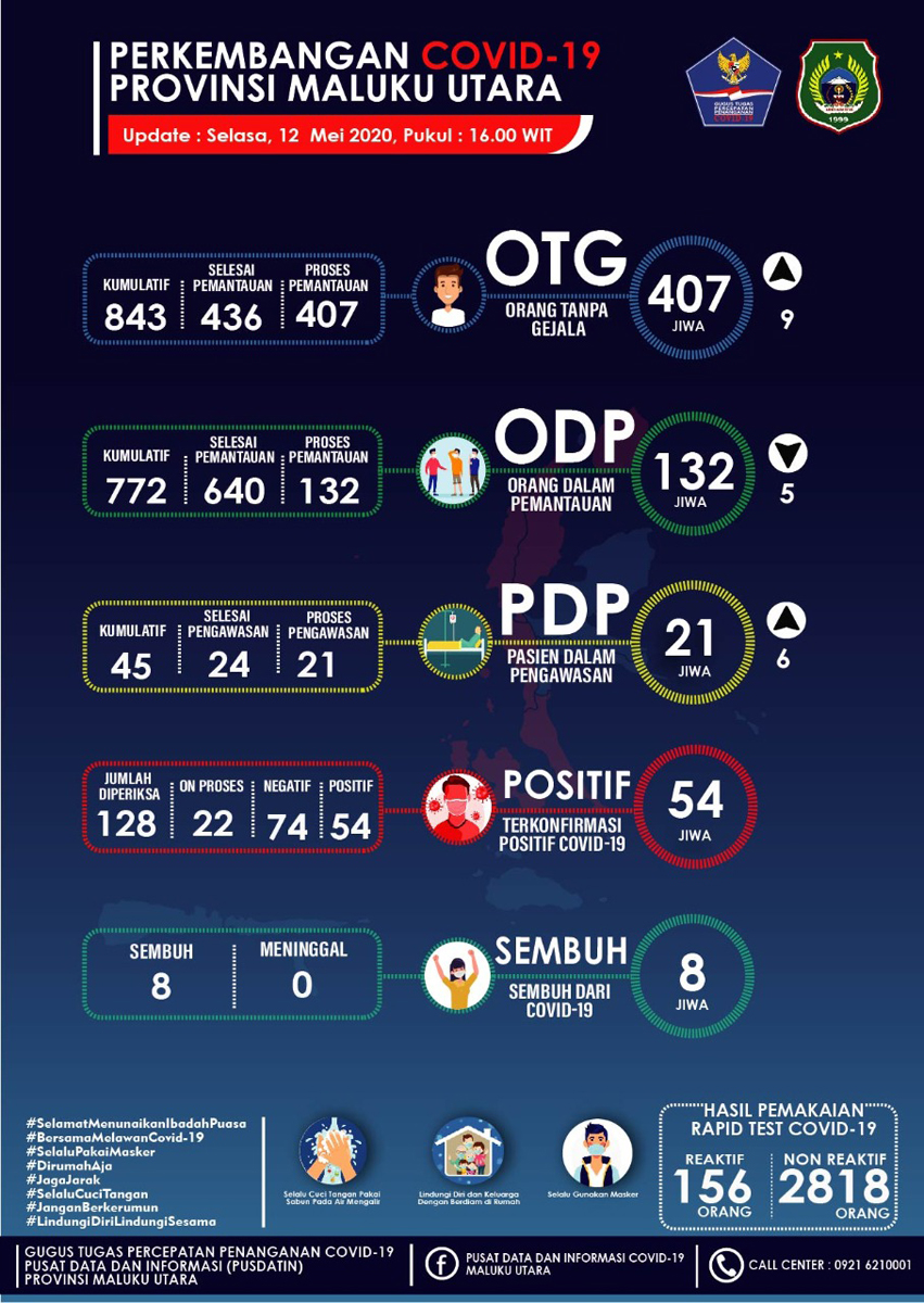 Gugus Tugas Percepatan Penanganan Covid-19 Provinsi Maluku Utara (Malut) kembali melaporkan perkembangan status kasus covid-19 melalui rilis pers pada Selasa (12/5/2020).