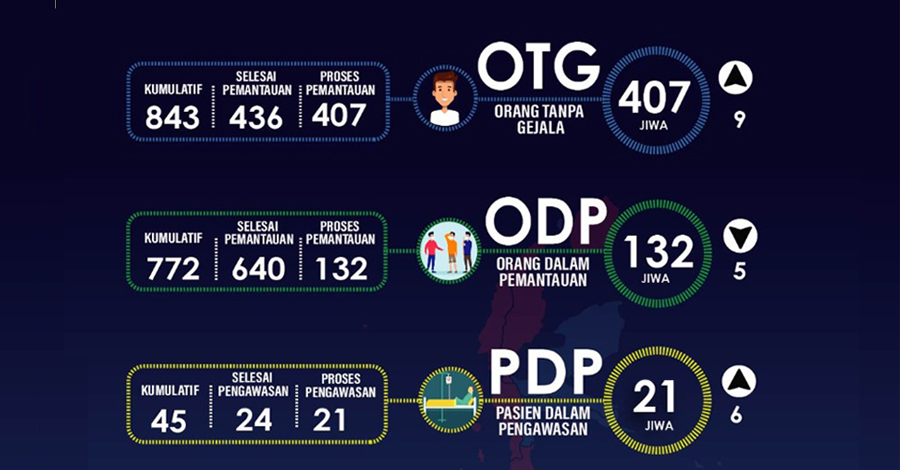 Dalam rilis tersebut Disebutkan, jumlah kasus Orang Tanpa Gejala (OTG) terjadi penambahan sembilan dikarenakan adanya tracking kontak dengan pasien positif terutama di Kabupaten Kepulauan Sula. Namun ada juga pengurangan di Kabupaten Halmahera Barat dan Kabupaten Halmahera selatan dikarenakan telah selesai masa pemantauan selama 14 hari. Total OTG menjadi 407 orang.