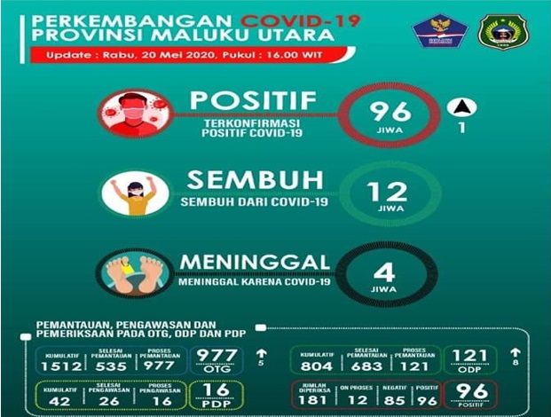 Pusat Data Gugus Tugas Percepatan Penanganan Covid-19 Maluku Utara kembali merillis sebaran kasus pasien Covid-19 pada Rabu (19/05/2020).