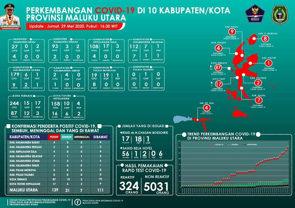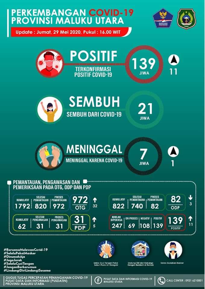 Gugus Tugas (Gustu) Percepatan Penanganan Covid-19 Provinsi Maluku Utara (Malut) kembali merilis data perkembangan covid-19 per 29 Mei 2020. Berdasarkan data yang diperoleh Haliyora.com, Jumat (29/05/2020) petang, disebutkan jumlah yang terkonfirmasi positif di Malut totalnya kini menjadi 139. Artinya, ada penambahan 11 dibanding data sebelumnya yang berjumlah 128.