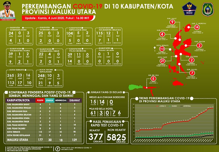 Tim Gugus Tugas Provinsi Maluku Utara kembali menyampaikan situasi terkini perkembangan Covid-19 di Maluku Utara per 4 Juni 2020. Dalam keterangan tertulisnya disampaikan, perkembangan situasi Covid-19 ini bersumber dari pengolahan data di Pusat data dan informasi gugus tugas Covid-19 Maluku Utara yang diperoleh dari Dinas Kesehatan Kabupaten/Kota dan KKP Kelas III Ternate.