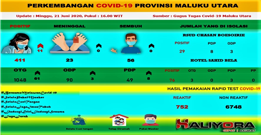 Dengan hasil pemeriksaan terbaru pada hari ini Minggu (21/6), maka jumlah kasus terkonfirmasi positif di Provinsi Maluku Utara menjadi 411 orang. Selanjutnya kasus baru ini disebut kasus 401-411.