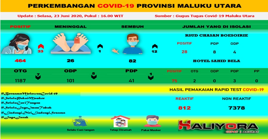 Tim Gugus Tugas Provinsi Maluku Utara kembali menyampaikan situasi terkini perkembangan Covid-19 di Maluku Utara per 23 Juni 2020.