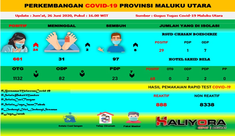Gugus tugas percepatan penanganan Corona Virus Disease (Covid-19) Provinsi Maluku Utara kembali mengumumkan perkembangan Status Kasus Covid-19 pada Jumat, (26/6).