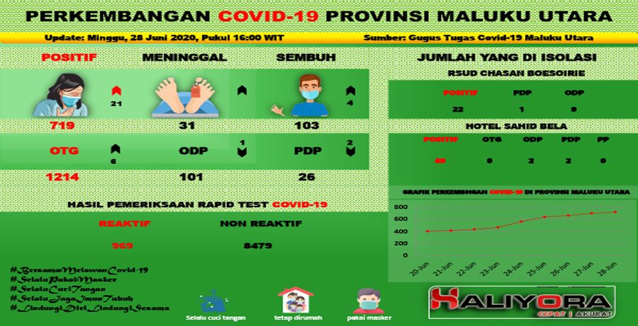 Dengan hasil pemeriksaan terbaru pada hari ini Minggu (28/6), maka jumlah kasus terkonfirmasi positif di Provinsi Maluku Utara menjadi 719 orang. Selanjutnya kasus baru ini disebut kasus 699-719.
