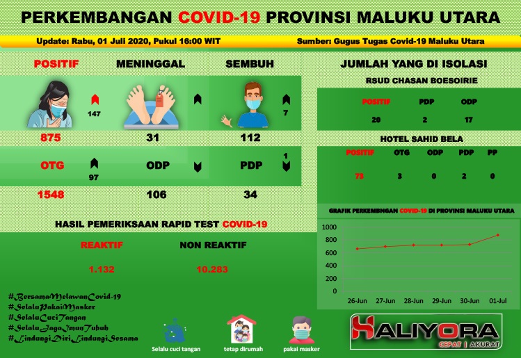 Dalam keterangan resmi yang diterima Haliyora.com, pada Rabu malam (01/07/2020), disebutkan, jumlah Orang Tanpa Gejala (OTG ) hari ini sebanyak 1548 orang. Ada Penambahan sebanyak 97 orang. Penambahan terdapat di tiga Kabupaten/kota yakni, kabupaten Halsel, Halut dan Haltim dikarenakan adanya tracking kontak dengan pasien positif. Selain penambahan terdapat juga pengurangan di Kepsul dan Kota Ternate.