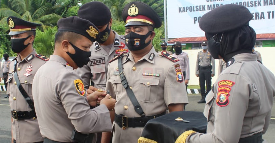 Kepala Kepolisian Resort Halmahera Timur AKBP Mikael. P. Sitanggang, S.IK, MH. Memimpin serah terima jabatan (sertijab) dua Kapolsek dengan tetap menggunakan Protokol kesehatan.