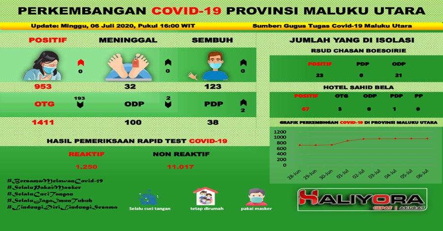 Dalam keterangan resmi yang diterima Haliyora.com, pada Senin malam (06/07/2020), disebutkan, jumlah Orang Tanpa Gejala (OTG ) hari ini sebanyak 1411 orang. Ada Pengurangan sebanyak 193 orang. Pengurangan terdapat di Kabupaten Halmahera Selatan dan Halmahera Utara. Selain pengurangan terdapat juga penambahan di Halbar, dikarenakan adanya tracking kontak dengan pasien positif.