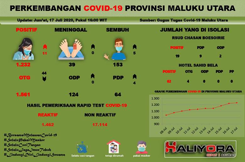 Dengan hasil pemeriksaan terbaru pada hari ini Jum’at (17/07), maka jumlah kasus terkonfirmasi positif di Provinsi Maluku Utara menjadi 1.232 orang. Selanjutnya kasus baru ini disebut kasus 1.222-1.232.