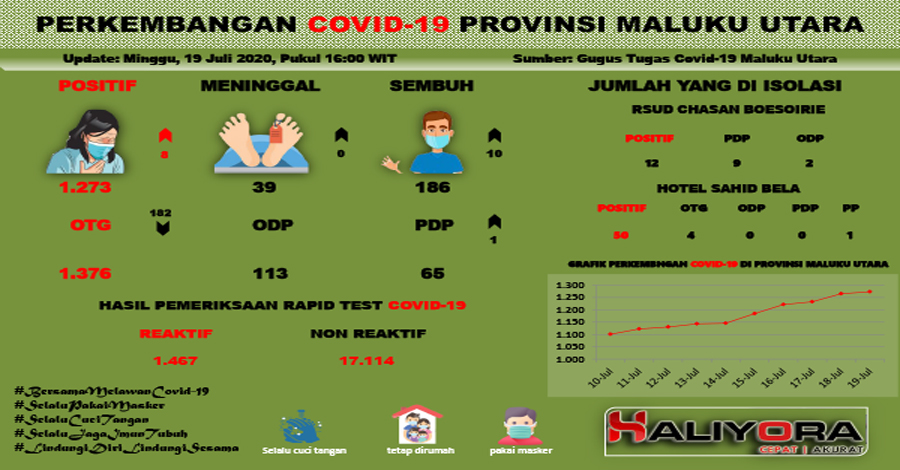 Tim Gugus Tugas Provinsi Maluku Utara kembali menyampaikan situasi terkini perkembangan Covid-19 di Maluku Utara per 19 Juli 2020.