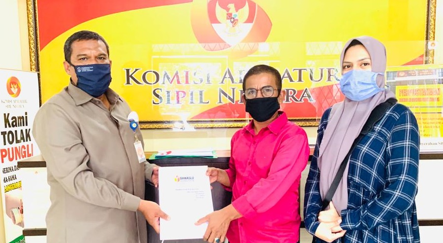 Badan Pengawas Pemilu (Bawaslu) Halmahera Selatan (Halsel), menyerahkan langsung berkas laporan 10 Aparatur Sipil Negera (ASN) yang terlibat politik praktis ke Komisi Aparatur Sipil Negara (KASN), di Kantor Bawaslu RI, Jalan Letjen MT Haryono nomor Kav. 52-53, Kelurahan Cikoko, Kecamatan Pancoran Jakarta Selatan, Senin (27/7).