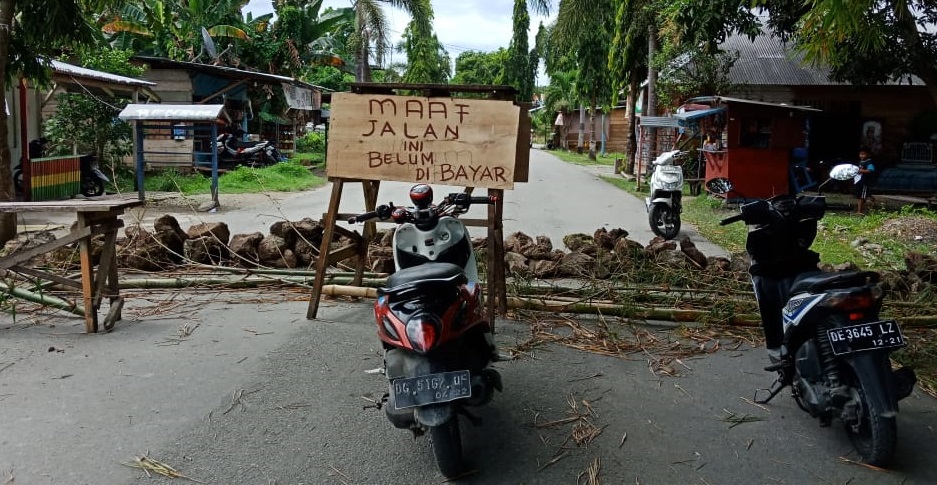 Amatan Haliyora, di lokasi tersebut, Rikiye memalang jalan di depan rumahnya memakai bambu dan batu, sepotong tripleks juga diikatkan pada sebatang bambu dengan tulisan, ‘MAAF, Jalan Ini Belum Dibayar. (Asbar-1)