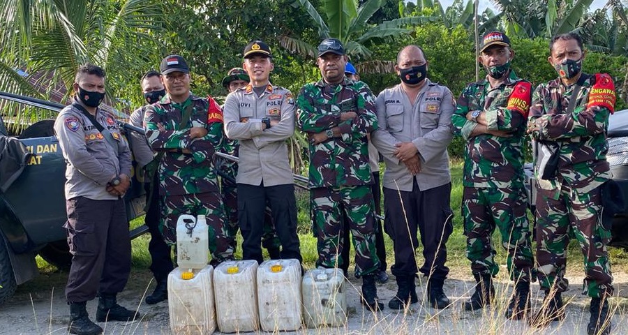 “Dalam rangka cipta kondisi jelang perayaan natal dan tahun baru, Polsek bersama anggota koramil melakukan patroli tempat pembuatan miras di dalam hutan, dan berhasil diamankan barang bukti berupa 100 liter miras jenis cap tikus di enam titik tempat pembuatan miras,” jelas Mansur, selasa (22/12/2020).