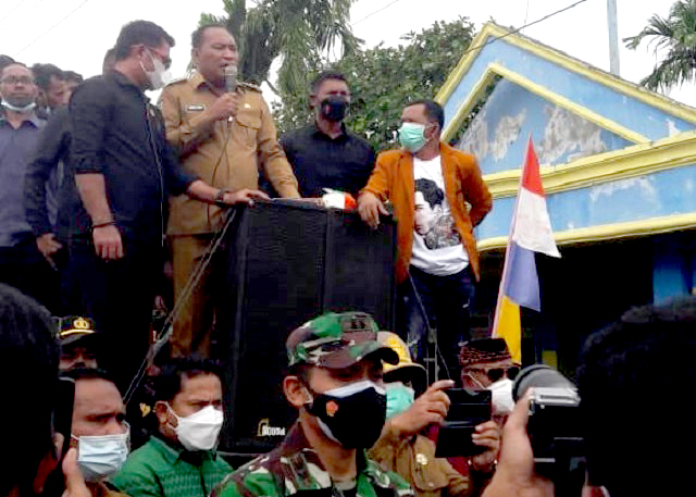 Setibanya di Kecamatan Obi, Bupati Usman dan sejumlah pejabat yang menyertainya langsung menemui ratusan massa aksi yang menggelar aksi di depan kantor Camat Obi.