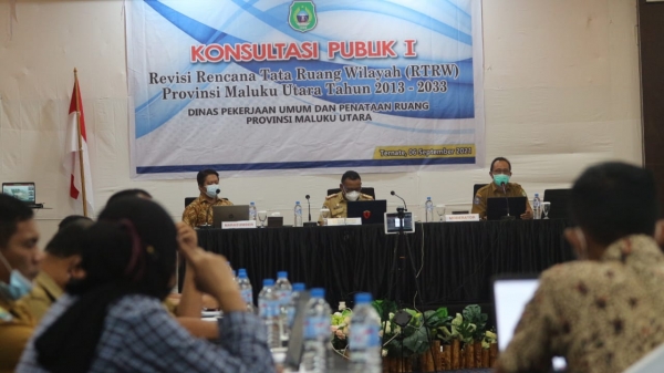 Ternate, Maluku Utara- Dinas Pekerjaan Umum dan Penataan Ruang (PUPR) Maluku Utara (Malut), melaksanakan konsultasi publik I revisi Rencana Tata Ruang Wilayah (RTRW) Maluku Utara tahun 2013-2033, Senin (6/9/2021) di Kota Ternate.