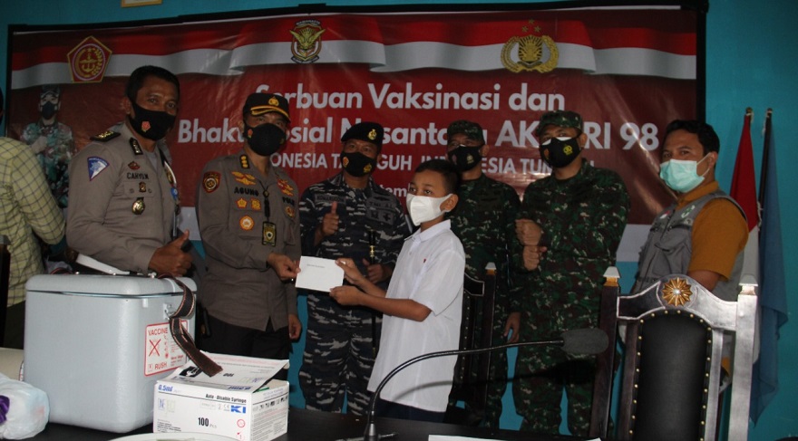 Ternate, Maluku Utara- Alumni AKABRI Tahun 1998 Maluku Utara, pada Selasa (21/09/2021) menyalurkan 200 dosis vaksin untuk siswa dan guru di SMPN 6 Kota Ternate serta membagikan voucher kuota internet dalam rangka menunjang proses belajar online bagi siswa.