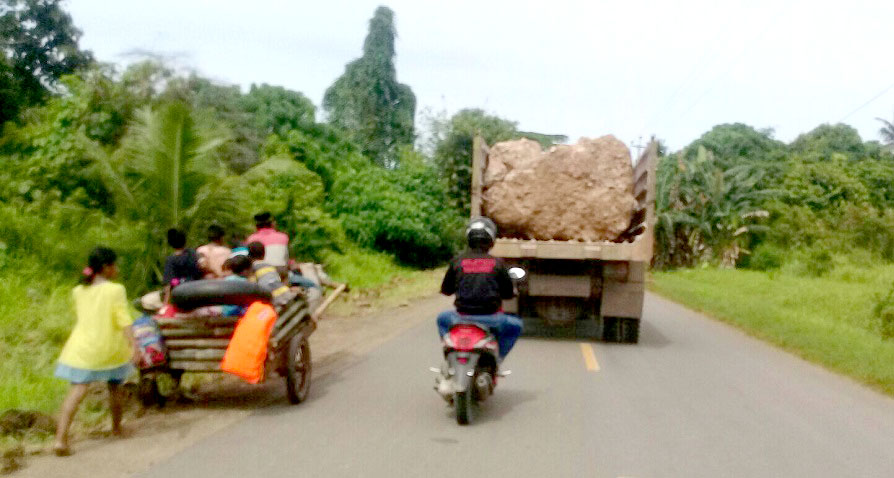 Morotai, Maluku Utara- Sejumlah mobil dump truck mengangkut material berupa tanah dan batu besar tanpa pengaman melintasi jalan raya (ruas jalan Desa Momujiu-Daruba). Bahkan melaju dengan kencang saling mendahului.
