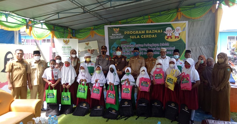 Sanana, Maluku Utara- Badan Amil Zakat Nasional (Baznas) Kepulauan Sula memberikan bantuan perlengkapan sekolah untuk siswa kurang mampu dan berprestasi tingkat Sekolah Dasar (SD) pada program Sula Cerdas