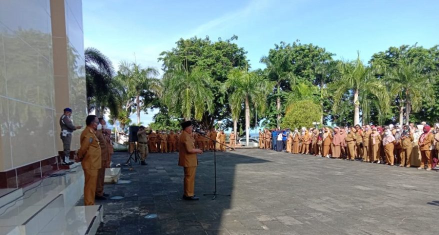 Sofifi, Maluku Utara- Gubernur Maluku Utara Abdul Gani Kasuba (AGK) memimpin apel hari pertama masuk kantor tahun 2022 di depan kantor gubernur, Jalan Raya Lintas Halmahera, Gosale Puncak, Kecamatan Oba Utara, Kota Tidore Kepulauan, Senin (3/1/2022).