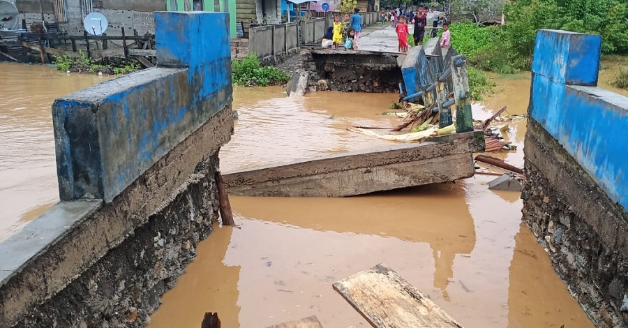 Halsel, Maluku Utara- Hujan deras mengguyur Desa Sabatang Kecamatan Bacan Timur. Derasnya hujan mengakibatkan air sungai Maskapei meluap dan terjadi banjir. Bahkan hantaman banjir membuat dua unit jembatan ambruk, talud penahan banjir patah, gedung Posyandu roboh dan banjir merendam puluhan rumah warga.