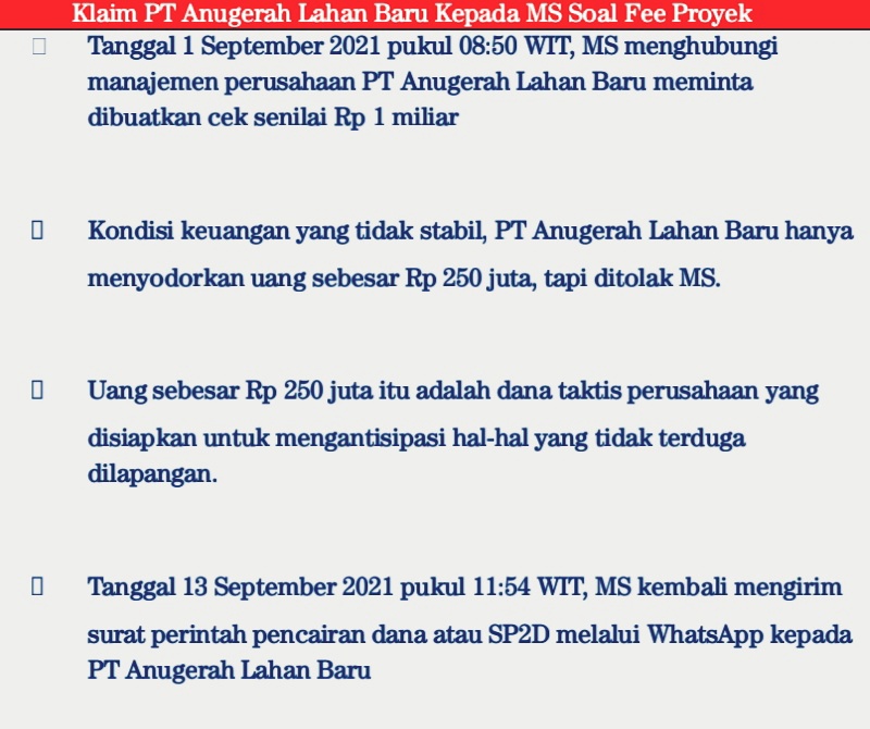 Staf PT Anugerah Lahan Baru, Joko Sukirno kepada wartawan mengungkapkan, pada 1 September 2021 pukul 08:50 WIT, MS alias Ucu menghubungi manajemen perusahaan dan meminta dibuatkan cek senilai Rp 1,5 miliar.