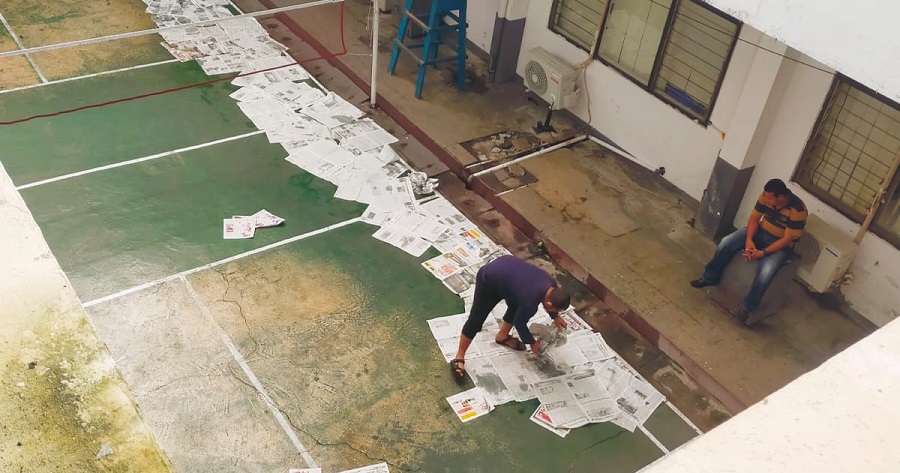 “Koran yang dipakai mengeringkan air itu koran lama yang saya ambil dalam salah satu ruangan. Dari pada tidak digunakan lagi dan akan dibuang, maka lebih baik digunakan untuk keringkan air di lapangan. Kalau air sudah kering nanti dikembalikan lagi ke ruangan,” ujar pegawai yang enggan menyebutkan namanya itu. (Arul-1)