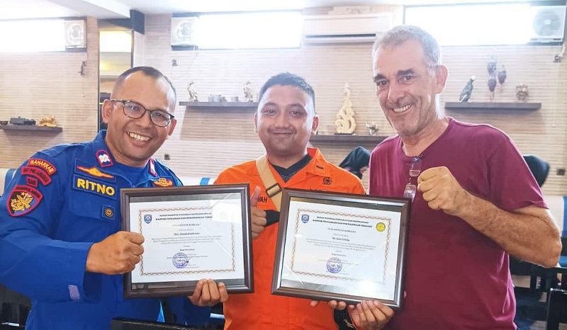Ternate, Maluku Utara- Kantor Pencarian dan Pertolongan Basarnas Ternate memberikan piagam penghargaan kepada potensi Search And Rescue (SAR) serta 2 orang Warga Negara Asing (WNA) yang terlibat dalam operasi KM. Cahaya Arafah di perairan Tokaka, Halmahera Selatan, Maluku Utara.