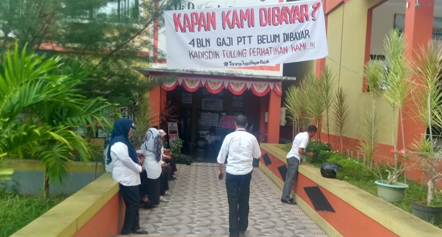“Kapan kami dibayar? 4 bulan gaji PTT belum dibayar, Kadisdik tolong perhatikan kami,” bahkan ada juga yang bertuliskan “Torang PTT SK Walikota bukan SK Kadis, sampai sini paham” Demikian dalam tulisan spanduk tersebut seperti pantauan Haliyora.