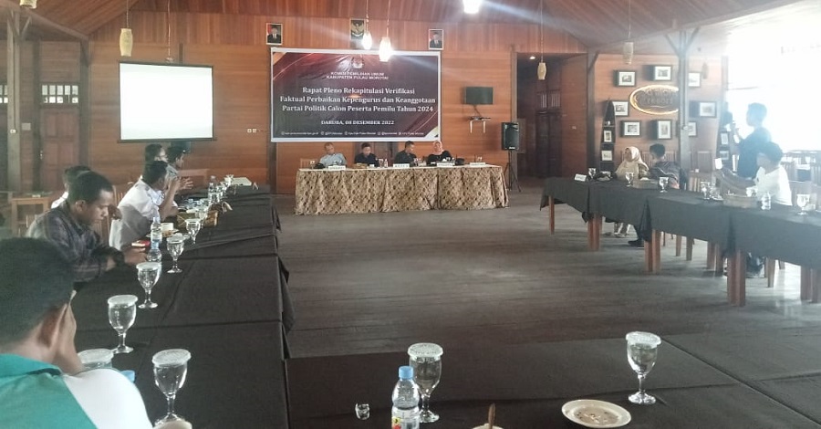 Morotai, Maluku Utara- Komisi Pemilihan Umum (KPU) Kabupaten Pulau Morotai (Pulmor), Provinsi Maluku Utara (Malut), menggelar rapat pleno rekapitulasi verifikasi perbaikan kepengurusan dan keanggotaan partai politik calon peserta pemilu tahun 2024, bertempat di Jababeka Resort, Kamis (8/12/2022).