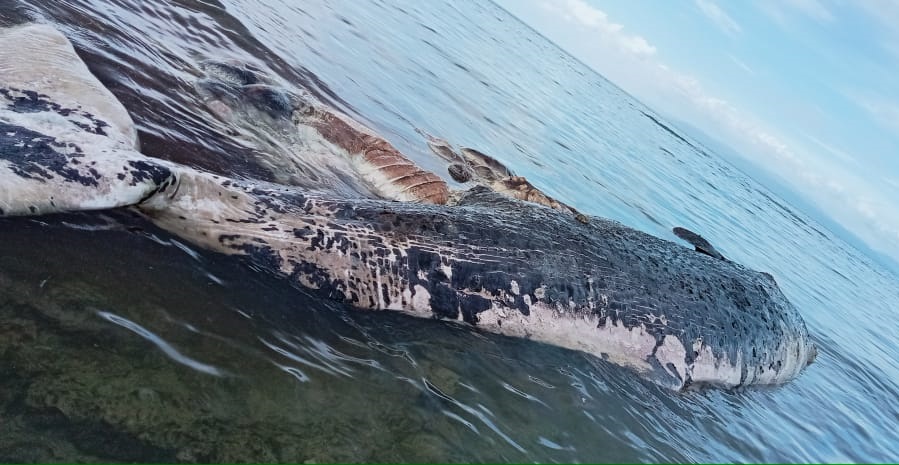 Morotai, Maluku Utara- Seekor paus raksasa dengan ukuran panjang sekitar lima meter ditemukan terdampar dalam kondisi mati di pesisir pantai Tanjung Desa Bobula, Kecamatan Morotai Selatan Barat (Morselbar), Pulau Morotai, Rabu (14/12/2022) sekitar pukul 07.30 WIT pagi tadi.