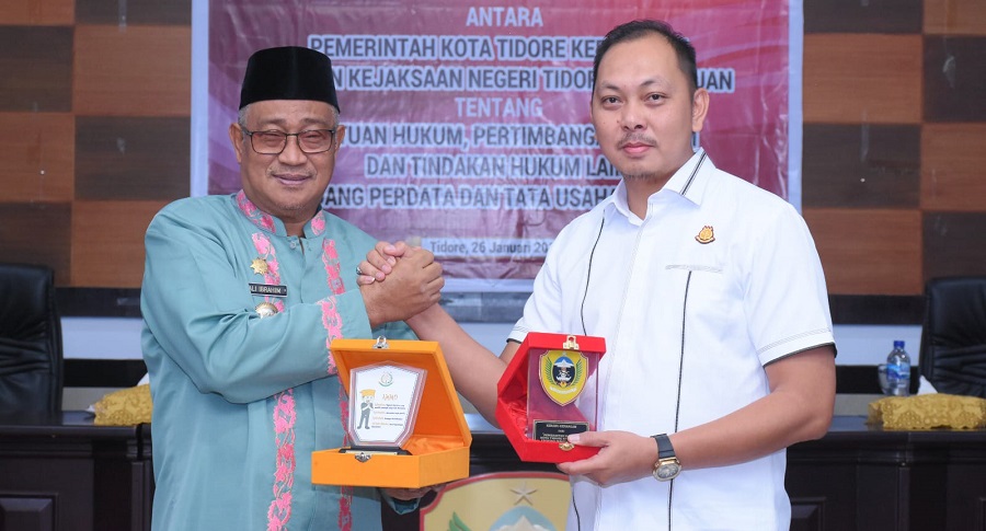 Tidore, Maluku Utara- Wali Kota Tidore Kepulauan (Tikep) Capt H Ali Ibrahim dan Kepala Kejaksaan Negeri (Kajari) Kota Tikep Faisal Arifudin melakukan penandatanganan nota kesepakatan antara Pemkot dan Kejari tentang Bantuan Hukum, Pertimbangan Hukum dan Tindakan Hukum Lain Bidang Perdata dan Tata Usaha Negara yang berlangsung di Ruang Rapat Walikota, Kamis (26/01/2023).