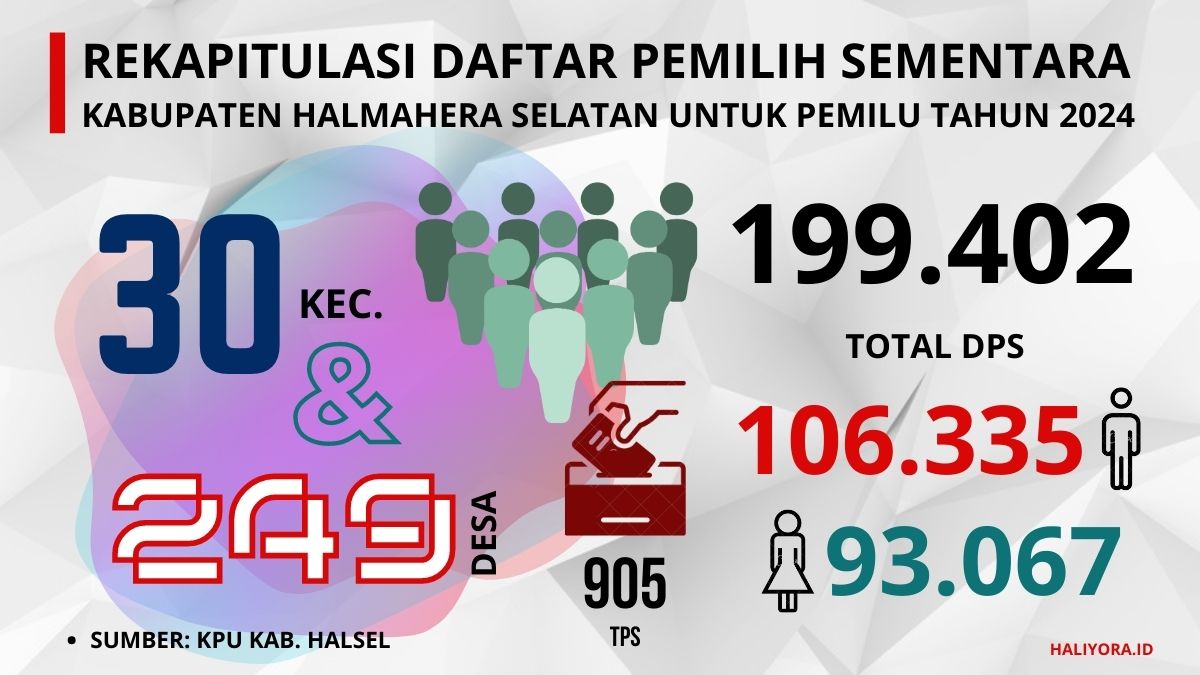 Labuha, Maluku Utara– Komisi Pemilihan Umum (KPU) Halmahera Selatan (Halsel) menetapkan Daftar Pemilih Sementara (DPS) wilayah Halsel sebanyak 199.402 pemilih untuk Pemilu 2024. Penetapan ini berdasarkan data rekapitulasi di 30 kecamatan di kabupaten tersebut.