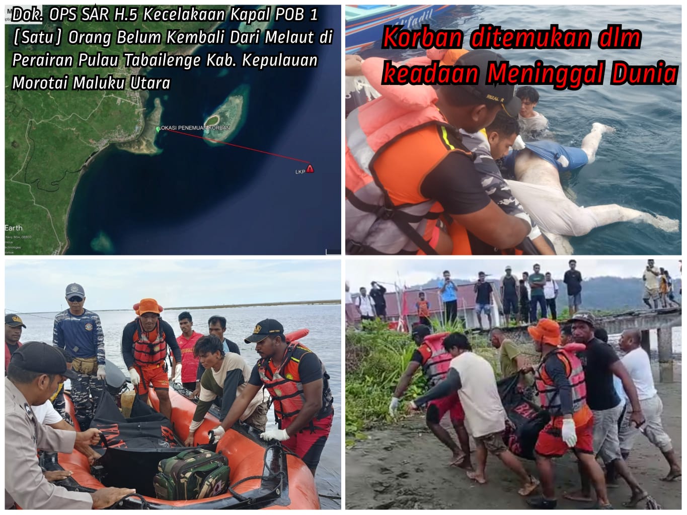 Daruba, Maluku Utara- Upaya pencarian terhadap Kasmin Bangunan (45), nelayan asal Desa Tanjung Saleh, Kecamatan Morotai Utara, Kabupaten Pulau Morotai, akhirnya membuahkan hasil.