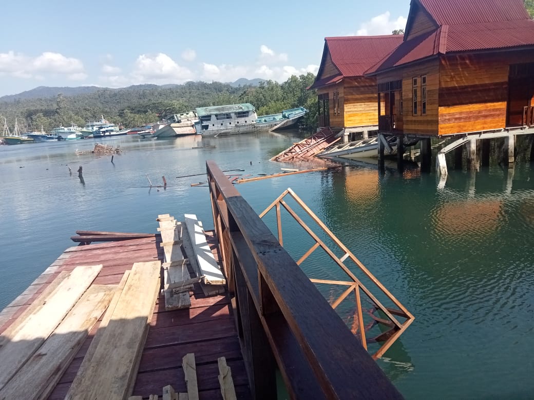 Sofifi, Maluku Utara- Jembatan mini di tempat wisata Doe-Doe, Kelurahan Guraping, Kota Tidore Kepulauan, Provinsi Maluku Utara mengalami kerusakan yang cukup parah akibat diterjang ombak pantai pada Jumat 28 September 2023 lalu.