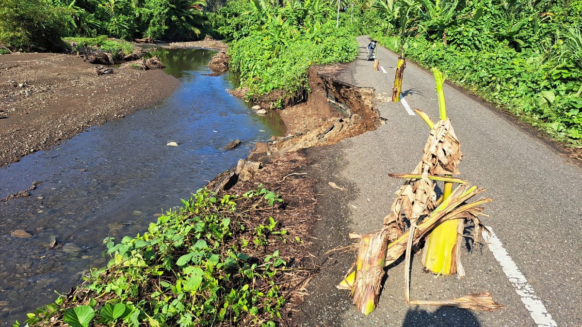 Kerusakan jalan yang diakibatkan banjir ini memakan separuh badan jalan, tepatnya di Desa Kususinopa, Kecamatan Oba.