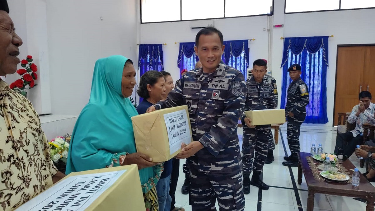 Daruba, Maluku Utara- Pangkalan TNI Angkatan Laut (Lanal) Pulau Morotai, Maluku Utara memberikan bantuan sembako dalam bentuk beras dan minyak goreng serta pengobatan gratis kepada warga Desa Juanga dan Darame di Kecamatan Morotai Selatan.