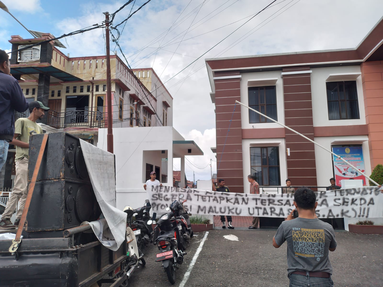 Pendemo dengan sebuah mobil yang dilengkapi sound sistem mendatangi PN Ternate sekitar pukul 12.00 Wit.