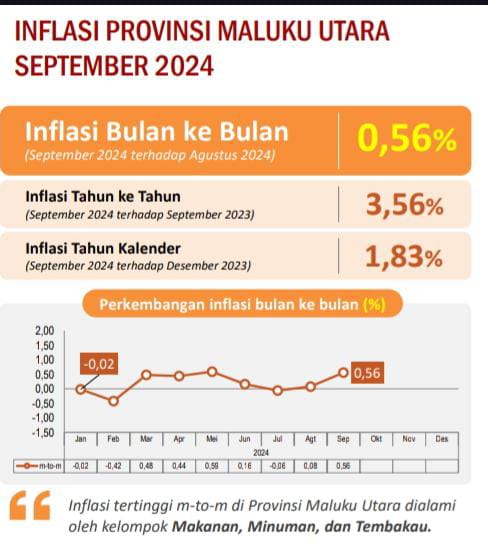 Ternate, Maluku Utara – Badan Pusat Statistik (BPS) mencatat Provinsi Maluku Utara mengalami inflasi month to month atau m-to-m pada bulan September 2024 sebesar 0,56 persen, sementara secara y-on-y sebesar 3,56 persen.