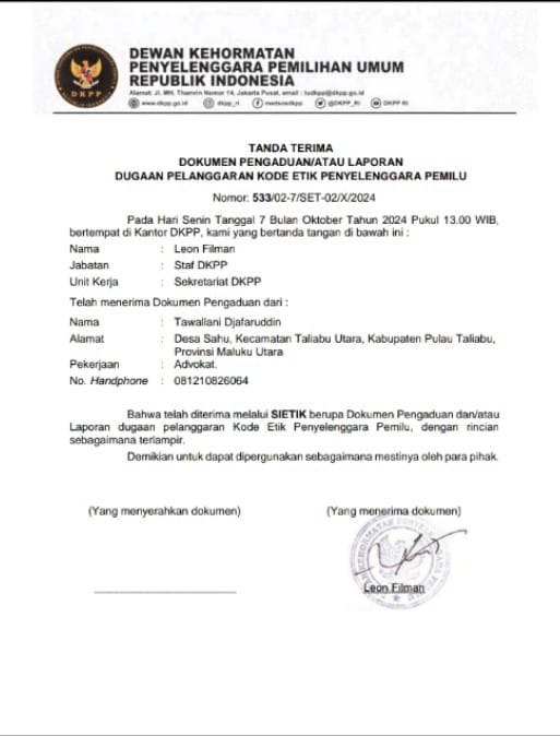 Bobong, Maluku Utara – Tim hukum pasangan calon Bupati dan wakil Bupati Pulau Taliabu Sashabila Mus dan La Ode Yasir (SAYA TALIABU) (SAYA TALIABU) resmi melaporkan KPU dan Bawaslu Kabupaten Pulau Taliabu ke DKPP RI.