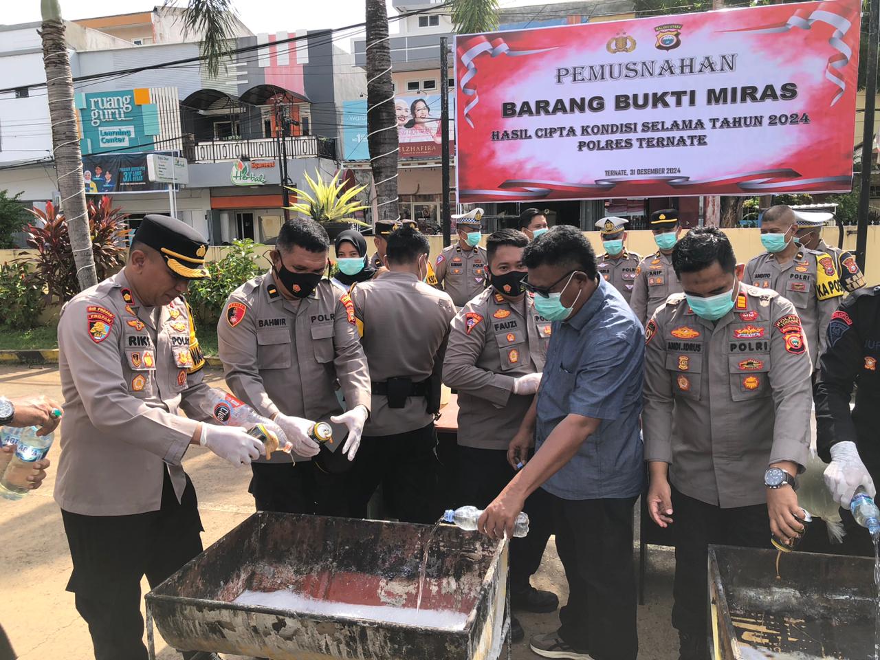 Ternate, Maluku Utara – Ribuan barang bukti minuman keras (Miras) jenis cap tikus dan merek guinness kemasan kaleng dimusnahkan Polres Ternate pada Selasa (31/12/2024).