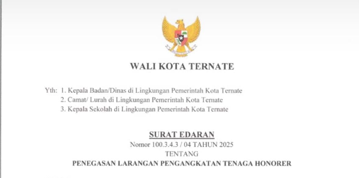 Surat Edaran larangan ini dengan Nomor :100.3.4.3 /04 Tahun 2025 tentang Penegasan Larangan Pengangkatan Tenaga Honorer, ditujukan kepada Kepala Badan/Dinas, Camat dan Kepala Sekolah di lingkungan Pemerintah Kota Ternate.