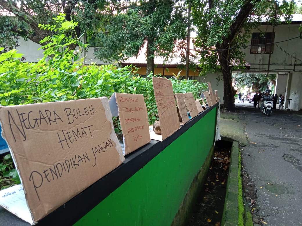 Ternate, Maluku Utara – Pamflet yang berisi penolakan pemangkasan anggaran pendidikan terpajang di emperan jalan Fakultas Keguruan dan Ilmu Pendidikan (FKIP), Unkhair Ternate.