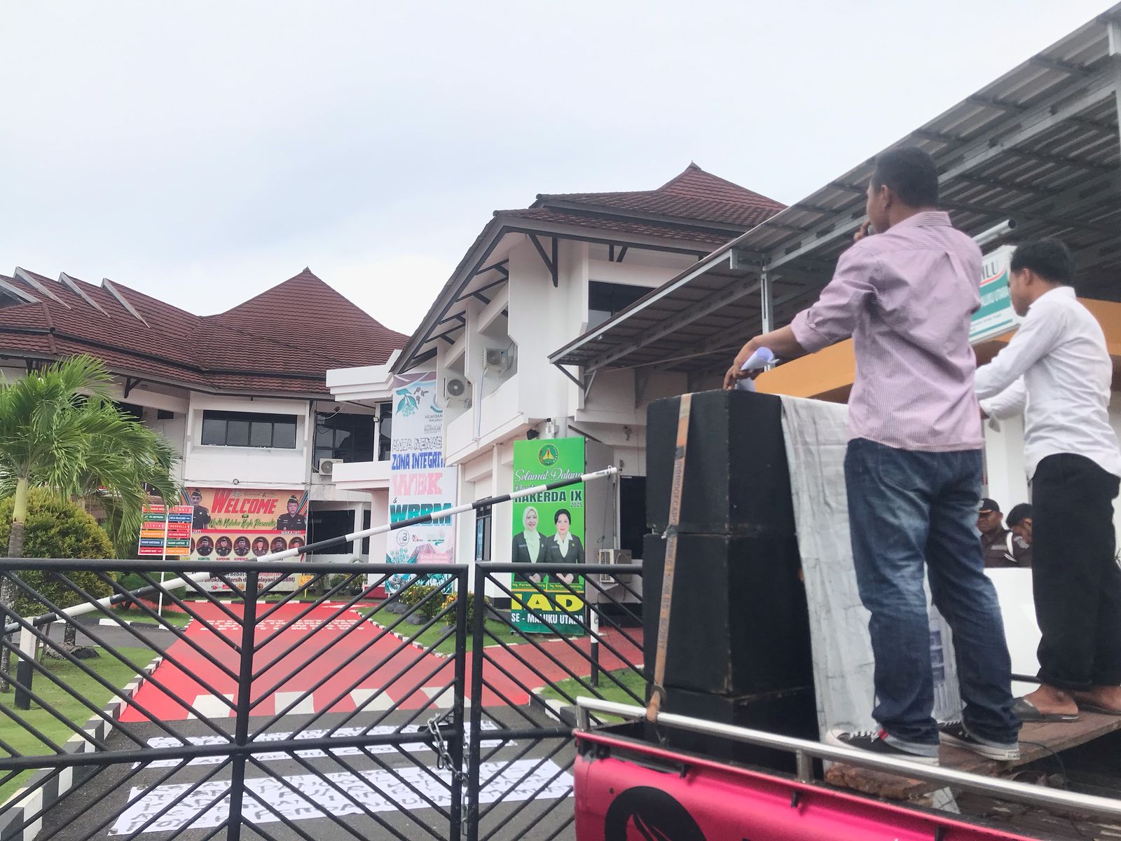 Massa aksi Fores terlihat mendatangi kantor Kejati menggunakan sebuah mobil truk yang dilengkapi sound system dan beberapa spanduk sekitar pukul 14.10 Wit, Senin (10/3/2025).
