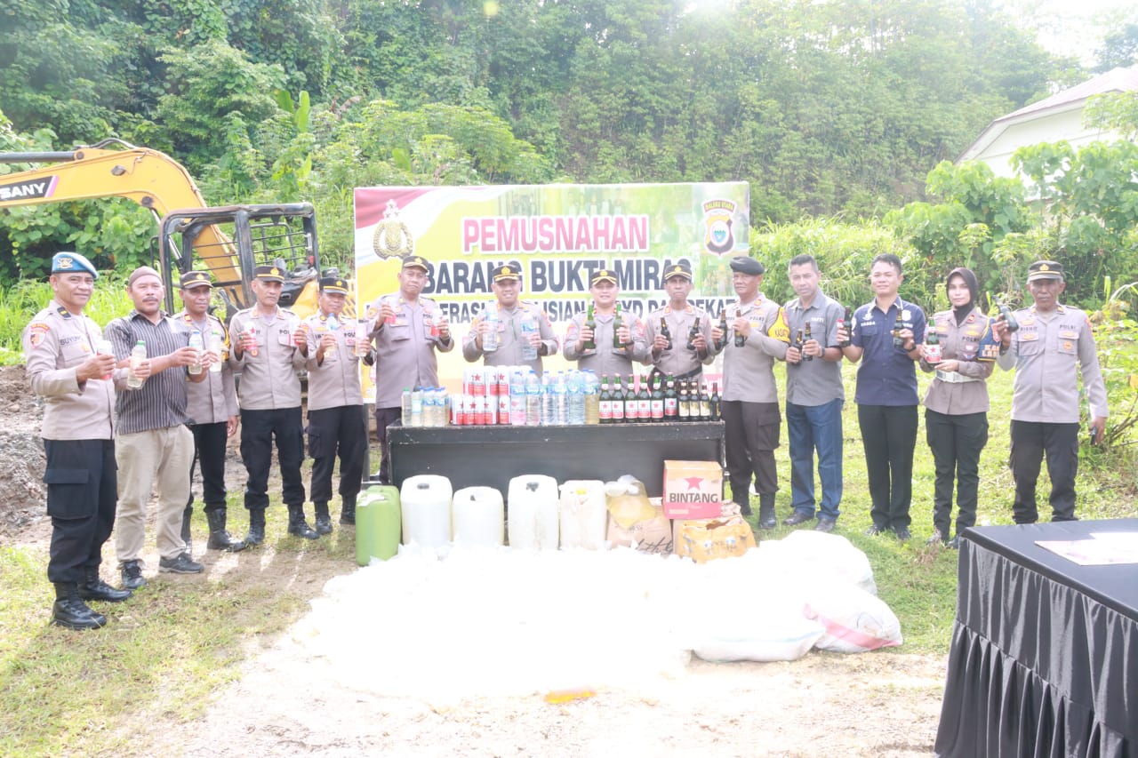 Pemusnahan dilakukan secara simbolis oleh Kapolres dan dilanjutkan dengan penghancuran total menggunakan alat berat. Barang bukti miras yang dimusnahkan merupakan hasil dari operasi penyakit masyarakat (Pekat) dan kegiatan rutin yang ditingkatkan (KRYD) yang digelar Polres bersama jajaran Polsek dan Subsektor.