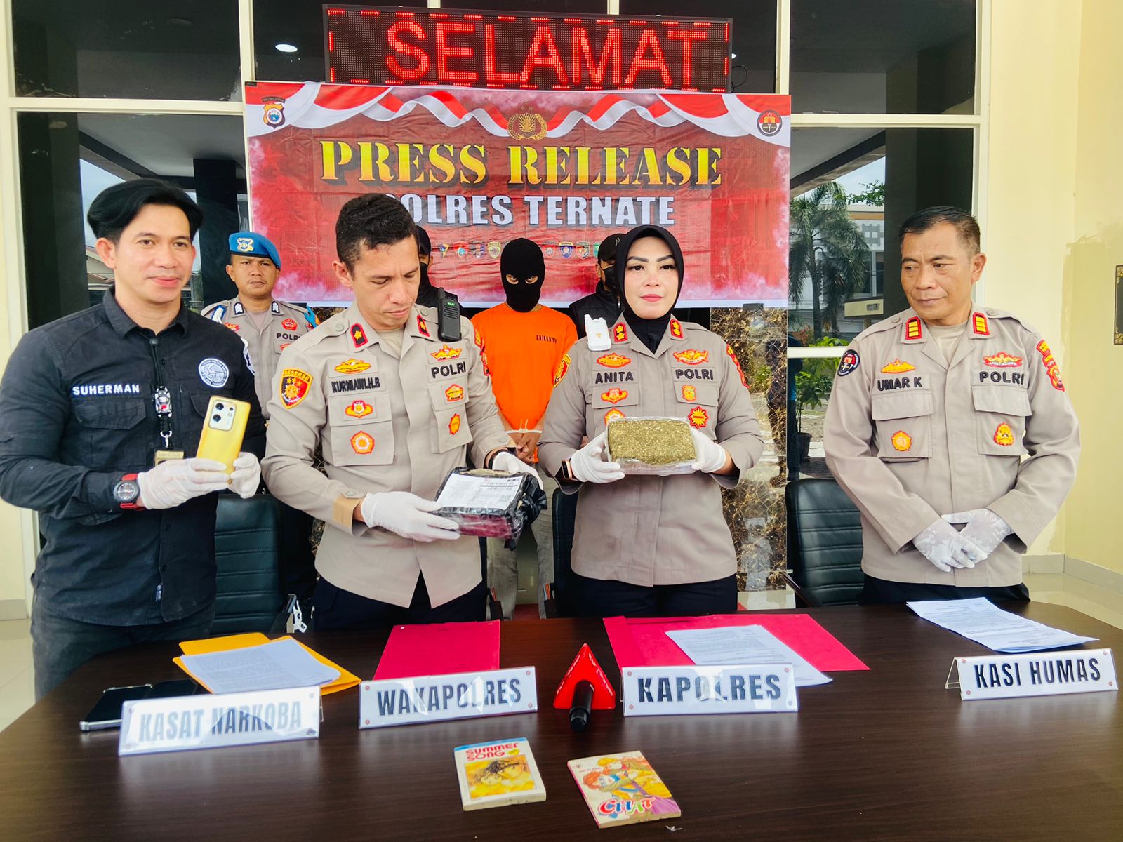 Kapolres Ternate, AKBP Anita Ratna Yulianto, saat konferensi pers menyatakan bahwa ganja tersebut dikemas dalam plastik bening dan dimasukkan ke dalam sebuah dos kiriman dengan nomor resi JD0472731009.