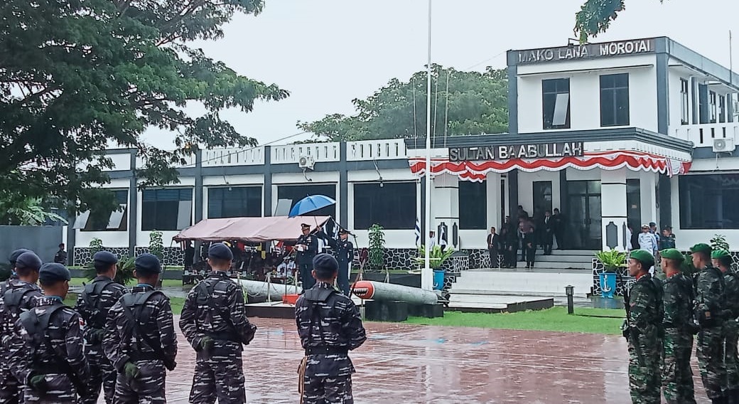 Daruba, Maluku Utara – Meski diguyur hujan deras, Pemerintah Kabupaten Pulau Morotai bersama Forkopimda tetap menggelar upacara peringatan Hari Lahir Pancasila di Lapangan Markas Komando Pangkalan TNI AL Sultan Baabullah, Desa Juanga, Kecamatan Morotai Selatan, Senin (2/6/2025).