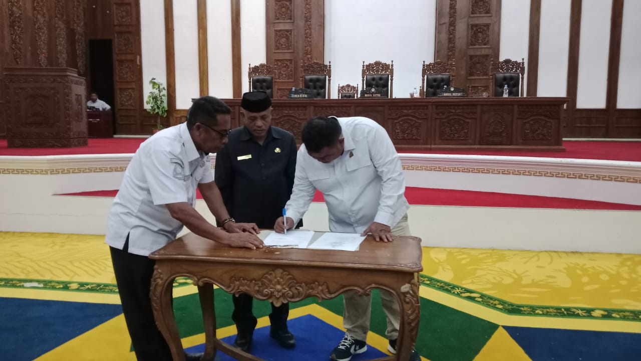 Pengesahan dilakukan melalui penandatanganan berita acara oleh pimpinan DPRD bersama Bupati Pulau Taliabu, Sahsabila Widya L. Mus, yang diwakili oleh Sekretaris Daerah (Sekda) Kabupaten Pulau Taliabu dalam rapat paripurna di Gedung DPRD, Rabu (26/11/2025).