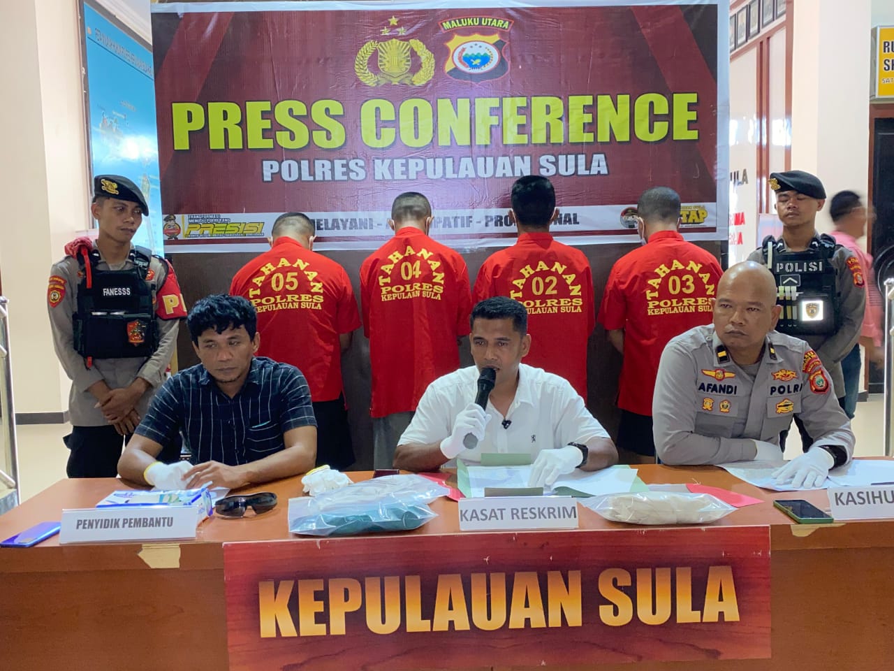 Kasat Reskrim Polres Kepulauan Sula, Iptu Wawan Lauwanto, dalam konferensi pers, Selasa (2/12/2025), menyampaikan bahwa para terduga pelaku yang kini ditetapkan sebagai tersangka adalah FSU alias Babalu (24), AAU alias Ais (24), MJU alias Jen (33), dan ZU alias Zul (39), semuanya merupakan warga Desa Mangoli.