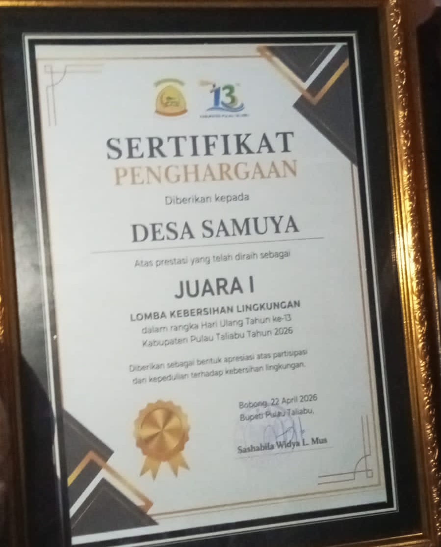 Bobong, Maluku Utara – Desa Samuya, Kecamatan Taliabu Timur, Kabupaten Pulau Taliabu, Maluku Utara, berhasil meraih Juara 1 dalam Lomba Kampung Bersih tingkat kabupaten tahun 2026. Capaian ini menjadi cerminan kuatnya kolaborasi antara masyarakat dan pemerintah desa dalam menjaga kebersihan lingkungan secara berkelanjutan.